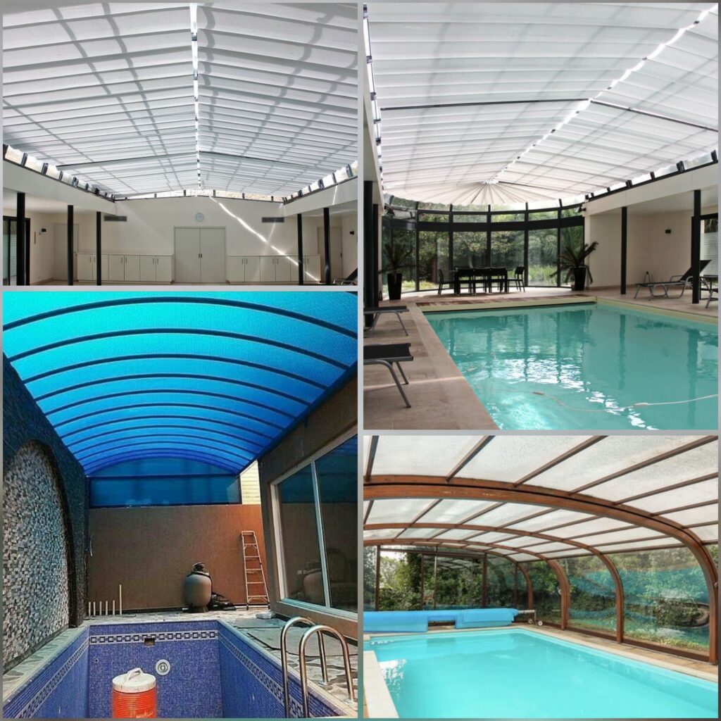 تُصنع من مادة لكسان الشفافة أو شبه الشفافة، وهي تشبه الزجاج لكنها أخف وزنًا وأكثر متانة. تسمح بدخول الضوء الطبيعي إلى المسبح مع حجب الأشعة فوق البنفسجية الضارة، مما يحافظ على حرارة معتدلة للماء ويمنح راحة للسباحين. تعتبر مثالية للمسابح التي تحتاج لتصميم عصري وجذاب مع الاستفادة من الإضاءة الطبيعية.